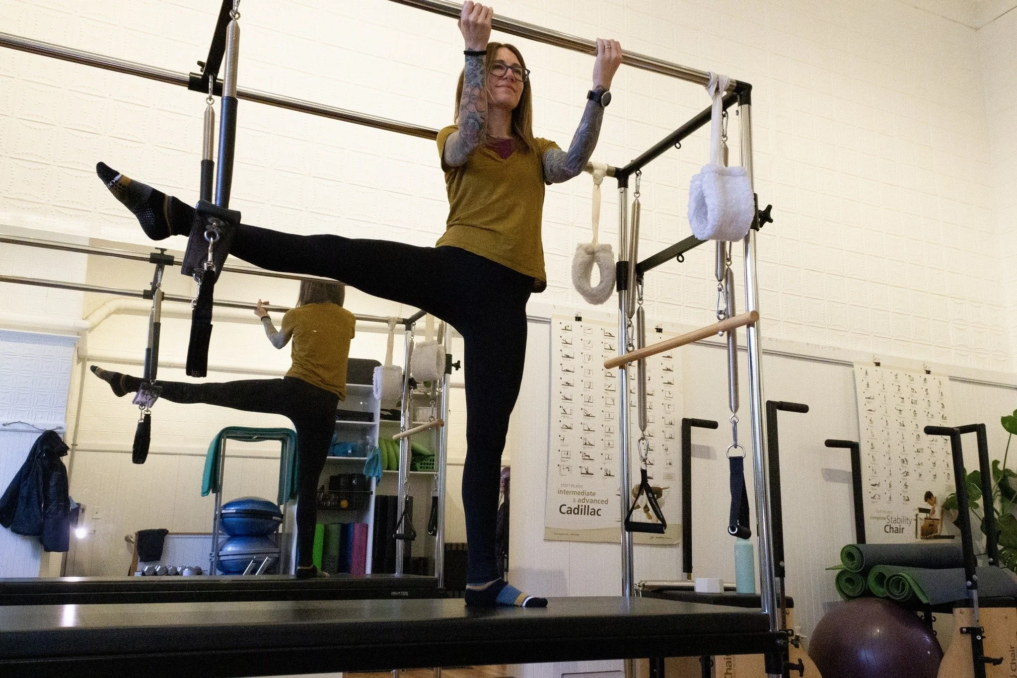 After first acquiring their 200 hour yoga certification Sheri found circus arts and a deeper understanding of bodily anatomy. Through this came the decision to leave their career as a chef to pursue all things movement. Going on to study for their NASM certified personal trainer certification and begin the journey into STOTT Pilates training.